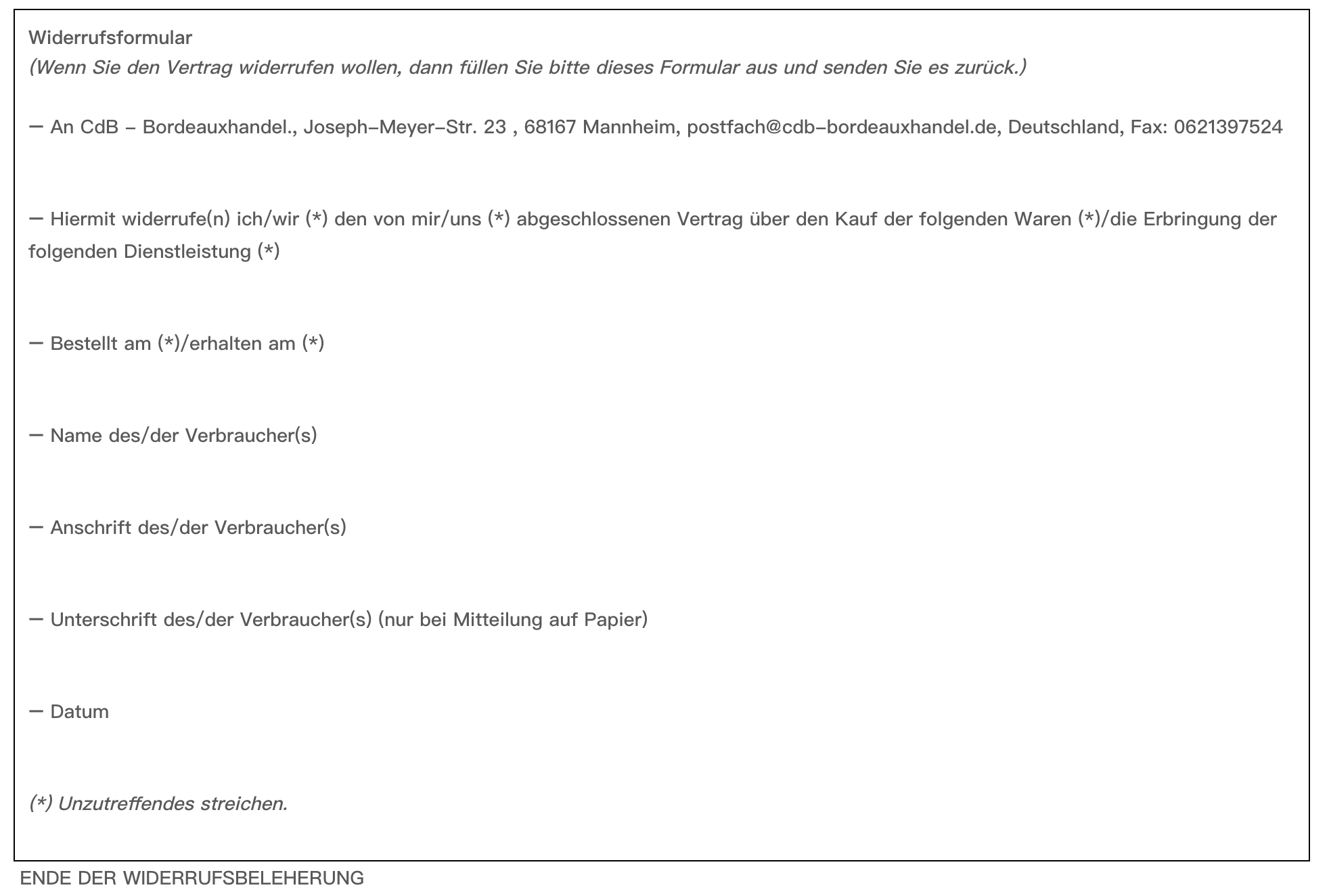 Um Ihr Widerrufsrecht auszuüben, müssen Sie uns (CdB-Botrdeauxhandel GmbH), Joseph-Meyer-Str. 23, 68167 Mannheim, Deutschland, postfach@CdB-Bordeauauxhandel.de, Telefon: 062139750, ) mittels einer eindeutigen Erklärung (z. B. ein mit der Post versandter Brief, Telefax oder E-Mail) über Ihren Entschluss, diesen Vertrag zu widerrufen, informieren. Sie können dafür das beigefügte Widerrufsformular verwenden, das jedoch nicht vorgeschrieben ist.